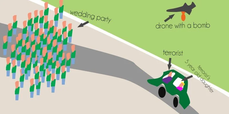 Imagine a terrorist has his car trunk packed full of explosives. You have been tracking his activity for a month and have every reason to believe that he intends to drive this car directly into a wedding party with 100 people celebrating in the street where he will detonate the explosives surely killing and maiming countless party attendees. There is a drone over his car armed with a missile which, if fired, would blow up the terrorist’s car and kill anyone inside of it. At the very last moment as his car is just 40 feet away from the wedding, you notice that his 5 year old daughter is in the backseat playing with a doll. Should the drone operator fire the missile?